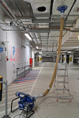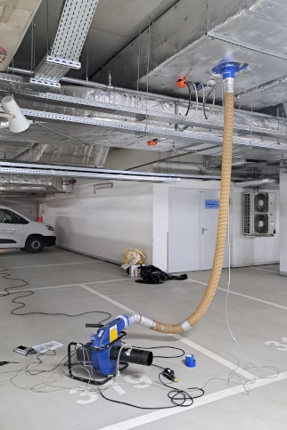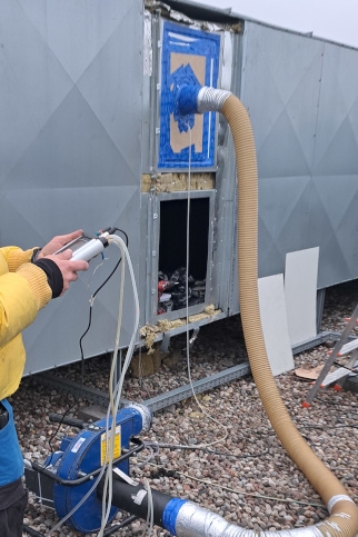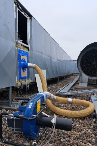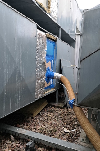 Badanie szczelności 10 układów wentylacyjnych zlokalizowanych na dachu budynku i na kondygnacji podziemnej. Powierzchnie układów od 40 do 300 m2.
